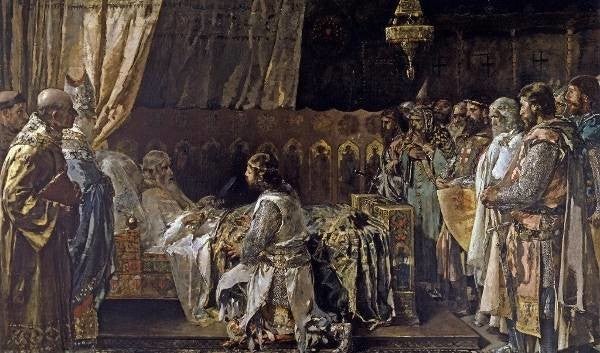 El 1876 va aconseguir, després d’una oposició prèvia i pel seu quadre Desembarcament de Francesc I a la platja de València, la pensió que li permetria prosseguir estudis a Roma, on va pintar a diverses acadèmies (Museu de Belles Arts de València), dibuixos i grans olis com Les filles del Cid i Abdicació del rei en Jaume al llit de mort (Museu del Prado), aquest darrer potser l’últim bon quadre d’història, gènere aleshores encara de moda. Reproduït en dimensions majors, va obtindre segona medalla a Madrid (1881) i, adquirit per l’Estat, es conserva al Museo Provincial de Zaragoza. A Roma va fer amistat amb Marià Fortuny i Bernat Ferrandis, que exerciren una positiva influència sobre ell.