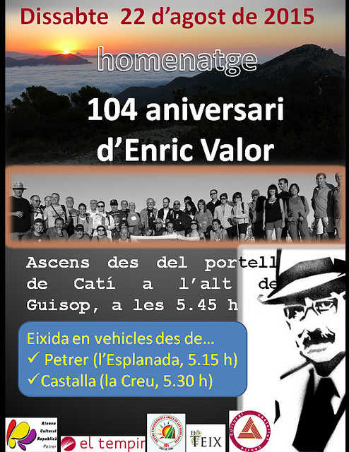 El mateix any, una iniciativa cívica promoguda pel Centre Cultural Castellut i l’Ateneu Cultural Republicà, de Petrer, vam promoure l’ascens a l’Alt de Guisop, de 1250 mts, a la serra de Castalla, per veure eixir el sol, el 22 d’agost, coincidint en el dia exacte del naixement del mestre i escriptor: “l’alba de Valor”.