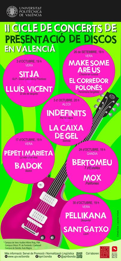 La UPV, a través del Servei de Promoció i Normalització Lingüística, organitza el II Cicle de concerts de presentació de discos en valencià per tal de promoure la música en valencià i oferir un espai als grups musicals per a presentar els seus discos.