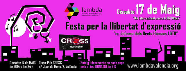 Lambda-Col·lectiu de lesbianes, gais, transsexuals i bisexuals, celebra un any més el 17 de Maig, Dia Internacional contra la LGTBfòbia, i ho fa amb una sèrie d’actes que pretenen denunciar la discriminació que segueix sofrint el col·lectiu LGTB a tot el món 25 anys després que l’OMS eliminara l’homosexualitat del catàleg de malalties. Enguany, i amb motiu de la proximitat de les eleccions municipals i autonòmiques, la celebració d’aquest dia va lligada a la demanda de lleis i accions reals que acaben amb la LGTBfòbia, un problema greu a València i a la resta de l’Estat, tal com reflecteixen les dades oficials del Ministeri de l’Interior, que mostren que els delictes d’odi per motiu d’orientació sexual i identitat de gènere s’han incrementat alarmantment en l’últim any.