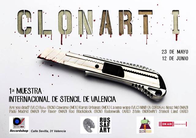 Els millors replicants de l’art de l’stencil estaran en CLONart , la 1a MOSTRA INTERNACIONAL DE STENCIL DE VALÈNCIA a València del 23 de maig al 12 Juny, a l’Associació Cultural Recordshop C / Sevilla, 31 ( Russafa , València ) .. El nostre soci Jose Carlos Díaz, és el coordinador d’aquesta encisadora i innovadora manifestació comunicativa a València. CLONart està organitzada pel Col·lectiu Atelier i On Air Comunicació , i s’inaugura el divendres 23 de maig a les 20:00 h . Aquesta mostra participarà en el circuit d’exposicions de Russafart 2014 que celebra al barri de Russafa els dies 30 i 31 de maig i 1 de juny. Jose Carlos és Llicenciat en Comunicació audiovisual per la Universitat de València. Productor de TVV entre 1989 i 2013 . Del 2004 al 2009 va estar en l’empresa privada i va desenvolupar sèries i programes per a IB3 , Televisió Canària i TVE , entre d’altres. Va dirigir la sèrie documental Acció Directa per a TVE i el documental Els pastors del bosc flotant . 20140523 Cartell anunci CLONart . CLONart a València. Art amb plantilles. València acull una mostra de graffiti realitzat amb stencil.