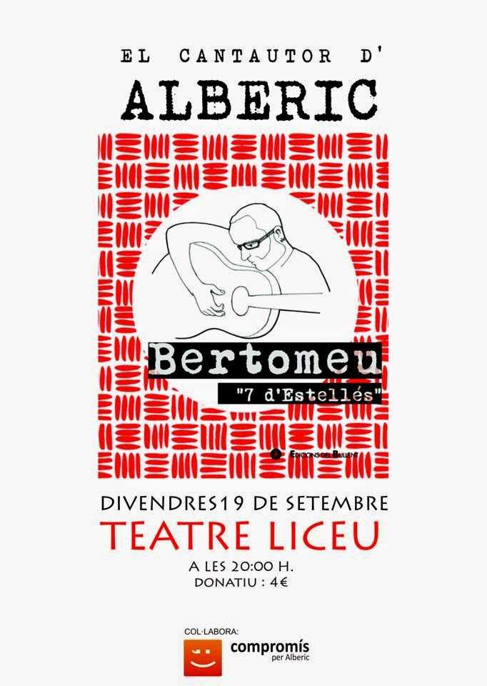 Aquest divendres, 19 de setembre de 2014 Bertomeu actuarà al Teatre Liceu d’Alberic amb les cançons que composen el llibre-disc 7 d’Estellés. Serà a les 20h. en el marc de la Festa Estellés d’Alberic i es demana una donació de 4 euros.