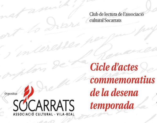 Divendres, 27 de novembre, arranca el cicle d’actes commemoratius de la desena temporada del Club de Lectura dels Socarrats de Vila-real. L’acte tindrà lloc al casal dels Socarrats (c. Sarthou Carreres, 38) a partir de les 19h, on hi haurà l’exposició dels 56 llibres que han comentat els membres del club. L’entrada és completament lliure. Al llarg de la temporada hi haurà sessions especials del club de lectura, visites d’autors, comentaris amb especialistes, etc.