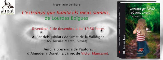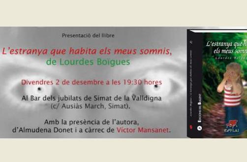 Al Bar dels jubilats (c/ Ausiàs March, Simat) la simatera Lourdes Boïgues presentarà la seua nova novel·la L’estranya que habita els meus somnis amb la presència de la regidora de cultura del poble