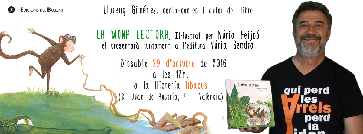 A la selva viu una mona molt curiosa, solidària i treballadora. Cada nit explica contes d’una maleta que és a l’altra banda del riu. La mona és una dels millors conta-contes de la selva, concretament de la riba esquerra del riu Limpopo, i Llorenç Giménez ho és el País Valencià. Vindrà a la llibreria Abacus acompanyat per Núria Sendra, editora d’Edicions del Bullent, a contar coses de La mona lectora.