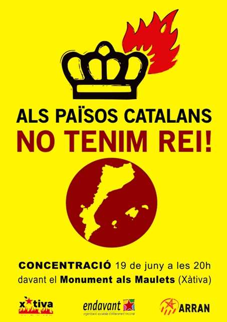 Per això és hora que el poble prenguem els carrers i la iniciativa. Dels enderrocs dels règim instaurat en la malanomenada transició democrática, del capitalisme que ha deixat milions de persones a l’atur, milers de families sense casa, que retalla els drets bàsics com la sanitat i l’educació, que precaritza encara més la vida de les treballadores, amb reformes laborals injustes… alçarem un nou país, sense reis ni prínceps, on allò important no siga el mercat, si nò les condicions de vida de les persones.