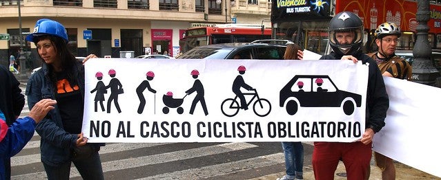 El nostre col·lectiu València amb bici, així com la resta de col·lectius de ciclistes urbans (coordinats per ConBici) ens oposem a tal obligatorietat perquè no hi ha raons de pes que la justifiquen ja que solament el 0,0001% d’entre els 3 milions de ciclistes urbans que hi han al nostre país, pateix ferides greus o mor per lesions cranials cada any. Es tracta d’una agressió que, sota el pretext de la seguretat individual, ataca al nostre lliure albir i més important encara: a la seguretat col·lectiva (les estadístiques demostren que amb aquesta mesura pot descendir l’ús de la bici un 40% i açò desprotexeis els escassos ciclistes que queden, a més que seguirà havent-hi un elevat númere de cotxes circulant per les ciutats amb la qual cosa la accidentabilitat mortal no descendirà). Els arguments presentats per a justificar l’obligatorietat són molt febles i volem conscienciar l’opinió pública d’açò amb la nostra acció.