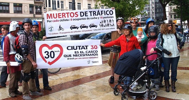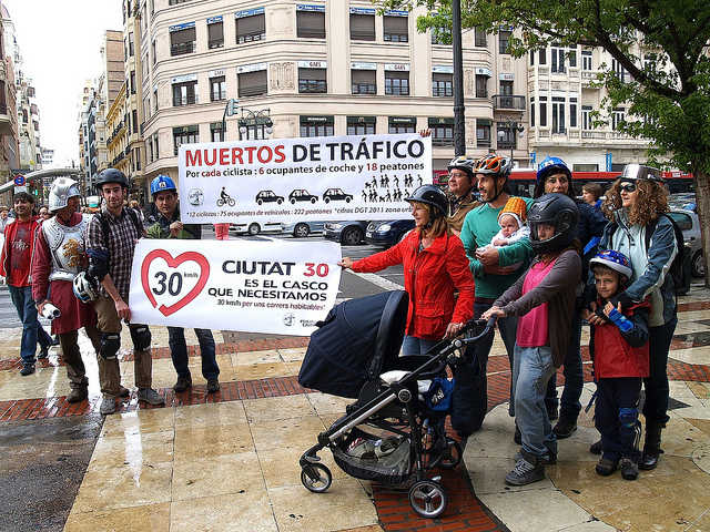 La vesprada d’aquest dilluns 27 ens hem concentrat, com a vianants, en el pas de vianants davant la Plaça de Bous, al carrer Xàtiva. Hem travessat vàries vegades amb la particularitat que portàvem cascs i armadures. Hem aconseguit una imatge ridícula, la d’una ciutat plena de gent utilitzant proteccions per a defensar-se de la inseguretat vial que genera majorment l’automòbil.