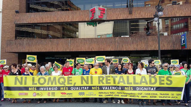 En conseqüència, ens hem concentrat este divendres 10 de juny a les 11h. a les portes de Delegació de Govern a València per a mostrar el rebuig a la LOMCE i a les retallades en educació . La Plataforma ha convidat als partits polítics a sumar-se a la prioritat de derogar la impopular i antidemocràtica LOMCE i exigir al pròxim govern una veritable llei de qualitat educativa. S’han adherit al manifest Podem PV, PSPV-PSOE, ERPV, EUPV, Els Verds PV i Compromís.