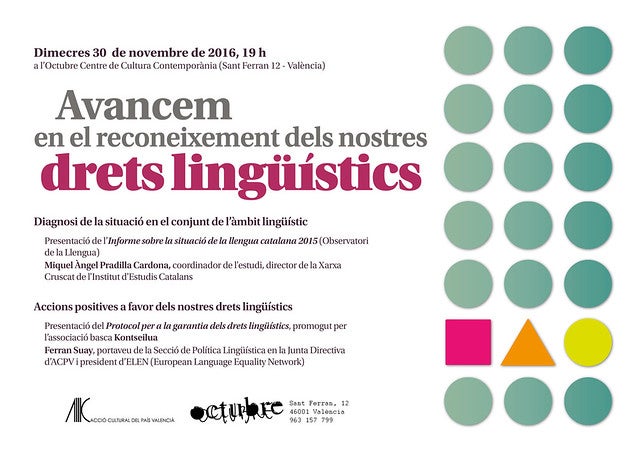 Acció Cultural del País Valencià (ACPV) presenta avui, en un acte que tindrà lloc a les 19 h a la seu de l’entitat a València, l’Octubre Centre de Cultura Contemporània (OCCC), dos informes referits a la situació de la llengua catalana i els drets lingüístics.