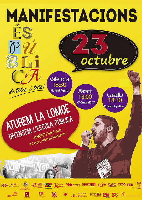 Les entitats FAPA-València, FAPA-Castelló Penyagolosa, CAVE-COVA, Escola Valenciana, Acció Cultural País Valencià (ACPV), Plataforma tots som Cremona i València Laica; els sindicats FE CCOO PV, Sindicat d’Estudiants PV, Intersindical Valenciana STEPV, Front Estudiantil PV, BEA, SEPC, Feu (Front Estudiantil Unificat Alcoi); i els partits Compromís, ERPV, EUPV, Podem Educació PV, PSPV-PSOE, PCPV, PCPE, CJC i Els Verds PV, van presentar el passat 21 d’octubre la convocatòria de manifestacions, que tenen com a motiu el rebuig a les retallades en l’educació pública i a la LOMQE.