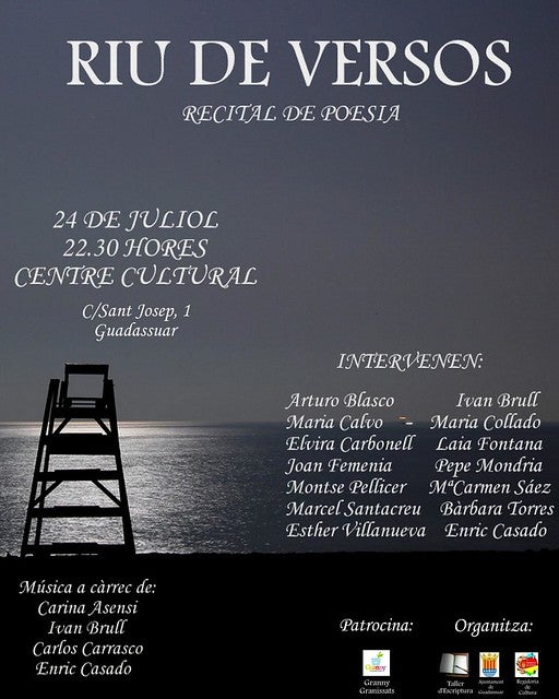 El proper divendres 24 de juliol a les 22.30 hores, Guadassuar acull el II Recital poètic nocturn Riu de Versos, organitzat pel Taller d’Escriptura i l’Ajuntament de Guadassuar i patrocinat per l’empresa local Granizados Granny que abastirà al públic amb granissats de fruita natural.
