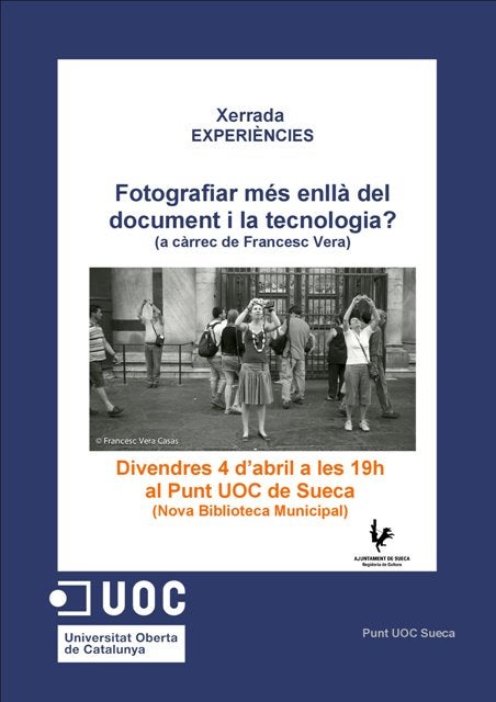 En segon lloc, aquest divendres 4 d’abril a les 19h hi ha una cita amb la fotografia al Punt UOC de Sueca (placeta dels Molins, 9). Fotografiar més enllà del document i la tecnologia? és el nom de la xarrada que oferirà Francesc Vera Casas i que versarà sobre l’ús de la càmera fotogràfica com a mitjà d’expressió personal.