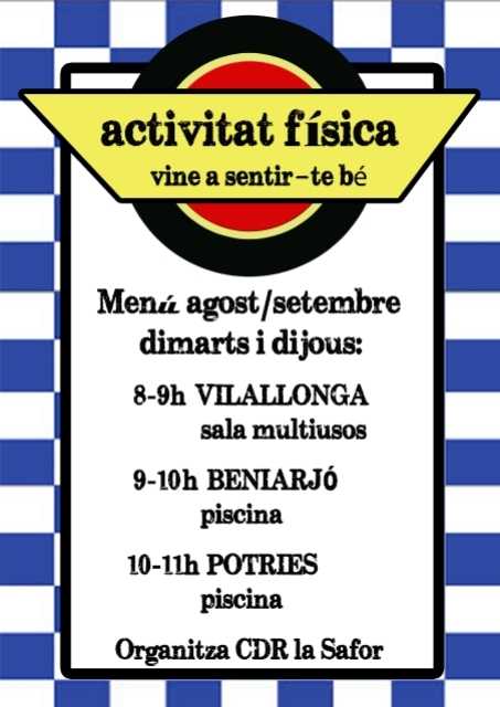 Durant els mesos d’agost i setembre ha programat curos d’activitat física gratuïts, tots els dimarts i dijous. A Beniarjó (9-10h) i Potries (10-11h), els cursos de manteniment físic tenen lloc a la piscina.
