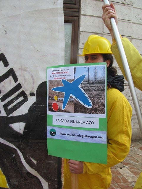 Un grup d’activistes d’Acció Ecologista-Agró i de la Plataforma Bosc Viu han desplegat avui, dijous 13 de març, una pancarta davant de les oficines centrals de La Caixa a València per a cridar l’atenció sobre les greus actuacions efectuades per la Conselleria de Medi Ambient amb finançament d’aquesta entitat bancària. Els ecologistes han mostrat imatges de les actuacions i han repartit informació als vianants per a donar a conéixer la gravetat de les actuacions que, paradoxalment, es presenten i es publiciten com a beneficioses per al medi ambient.