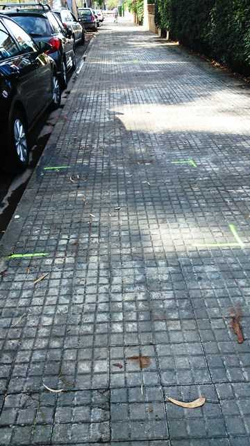 En substitució dels dos grans eucaliptus tallats plantaran altres espècies que lògicament tardaran anys a donar ombra, però el mes cridaner és que els volen plantar damunt de la vorera, més prop de les cases que els arbres actuals i ocupant l’espai dels vianants. Com s’aprecia en la foto pretenen traslladar també els fanals a la vorera. Tot per a deixar més espai per a aparcaments.