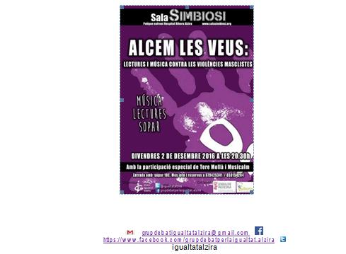 Este divendres 2 de desembre, a les 20 hores i en la sala Simbiosi d’Alzira, des del Grup de Debat us convidem a alçar les veus contra les violències masclistes.