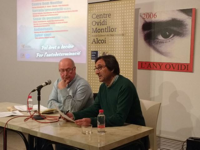 Vicent Luna, com a membre de la Plataforma pel Dret a Decidir del País Valencià (PDaDPV) de la comarca de l’Alcoià-Comtat, presentà a Toni Terrones, responsable de Relacions Polítiques i Moviments Socials de l’esmentada plataforma. Terrones fou qui ens parlà de com es va gestar aquest manifest. I és que davant la judicialització de la política catalana que l’estat està portant endavant, negant-se a acceptar la realitat i no volent seure a la taula per negociar, el poble valencià no podia restar impassible. Per això una vintena d’entitats de tot tipus, i d’arreu de les comarques, han donat suport signant aquest manifest. Entitats culturals, cíviques, sindicals i polítiques com ara, Acció Cultural del País Valencià, l’Assemblea Antirepressiva i per les Llibertats el Micalet, el Bloc d’Estudiants Agermanats, Castelló en Moviment, les CUPs d’Almàssera i Biar, Escola Valenciana, El Tempir, Estela Roja de Benimaclet, ERPV, Esquerra Valenciana, Estat Valencià, Intersindical Valenciana, JARIT, JODaD, Lambda, Plataforma pel Dret a Decidir, Plataforma per la Llengua, Poble Lliure, POSI, SEPC, Societat Coral el Micalet, Bloc Nacionalista Valencià…
