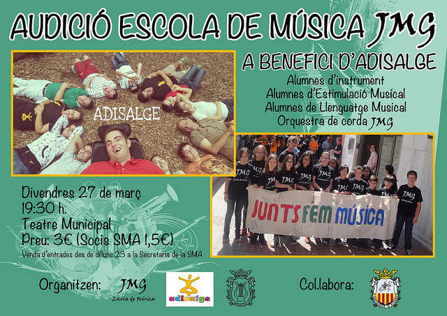 Per tal de posar punt i final a aquesta col·laboració, s’està preparant una audició molt especial. Aquesta tindrà lloc el proper divendres 27 de marça les 19:30h. al Teatre Municipal. El públic assistent podrà gaudir de les actuacions dels alumnes d’Estimulació Musical, Llenguatge Musical, Instrument i de la música de l’Orquestra de Corda JMG. La recaptació de les entrades es destinarà íntegrament a Adisalge.Aquestes es podran adquirir a la Secretaria de la Societat Musical (Casa de la Música – El Teular) durant tota la setmana de 17:00 a 20:00h. i una hora abans de l’espectacle a les Taquilles del Teatre. El preu de les entrades és de 3€ (Socis SMA 1,5€), a més s’han habilitat entrades en Fila 0 per tan sols 1€, per a que tot aquell que no puga assistir a l’audició però vulga col·laborar en la causa puga fer-ho.