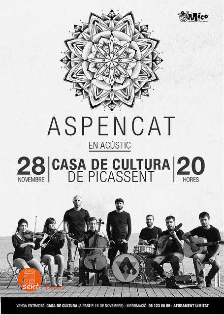 El pròxim 28 de Novembre a les 20 hores, ASPENCAT presentarà a la Casa de Cultura de Picassent el nou disc “Tot es ara”, oferint-nos per primera vegada la versió en acústic de l’espectacle, el qual va dirigit a audiències més reduïdes, on el contacte amb el públic es més directe, més intim.