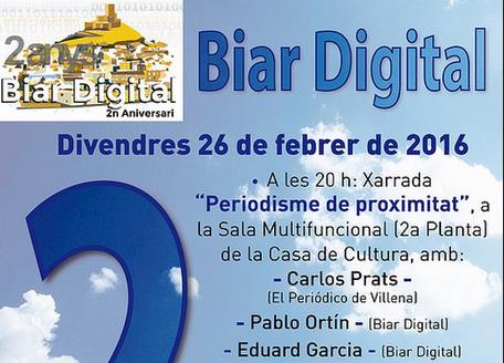 -20 h. Xarrada “Periodisme de proximitat” amb Carlos Prats, director d’El Periódico de Villena (EPdV), per part de Biar Digital intervindran dos membres de l’Equip: Pablo Ortín i Eduard Garcia.