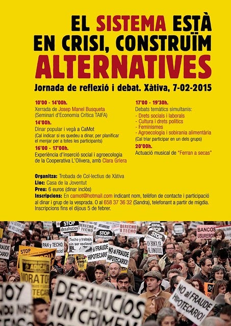 El pròxim 7 de Febrer acollirem a Xàtiva una jornada de formació anticapitalista organitzada per diferents col·lectius de Xàtiva. Dinamitzada des de les 10 del matí per l’activista militant i economista crític Josep Manel Busqueta del Seminari d’Economia Critica Taifa junt a la Clara Griera de la cooperativa d’inserció social i agroecologia L’Olivera.