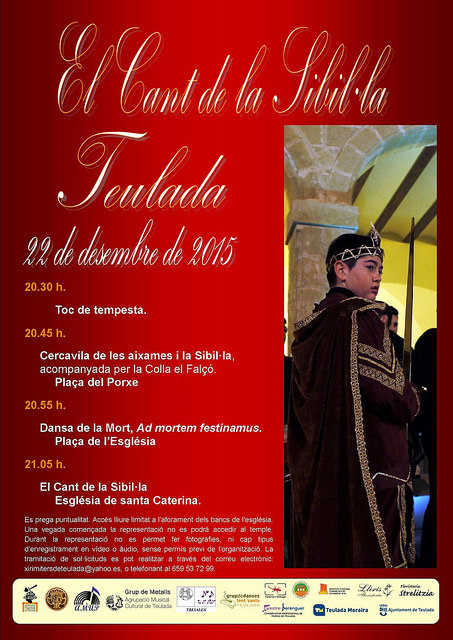 La posada en escena del Cant de la Sibil·la 2015 a Teulada es fa possible gràcies a la col·laboració de diferents entitats coordinades per Rafa Soriano, com a director artístic, i l’Associació dolçainers i tabaleters de Teulada, Colla el Falçó, com a entitat organitzadora. S’ha comptat amb l’alumnat del Conservatori de Música Mestre Berenguer, per a la selecció de les veus blanques que representen la Sibil·la i els Àngels Custodis, amb el cor de l’Associació de Músics Professionals de Teulada, el amb grup de metalls de l’Agrupació Musical Cultural de Teulada organitzat expressament per a aquest esdeveniment, i, enguany com a novetat, comptarem en els interludis musicals, amb el grup de música antiga i renaixentista Tresalen, i amb el Grup de Danses Font Santa que interpretarà, abans de l’acte, la Dansa de la Mort al ritme de la melodia Ad mortem festinamus, del Llibre Vermell de Montserrat (s. XIV).