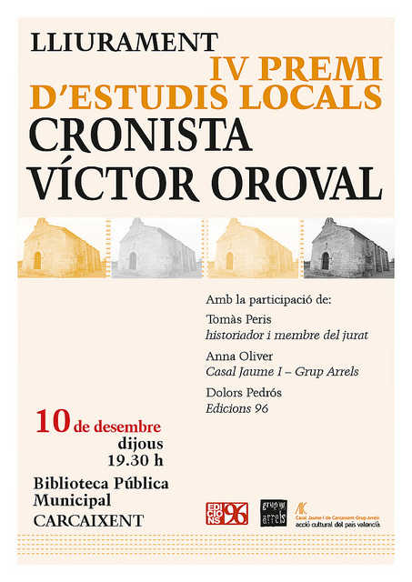 Dijous a les 19.30 hores a la Biblioteca Pública Municipal de Carcaixent Es fa el lliurament de la quarta d’edició del Premi d’Estudis Locals Víctor Oroval i Tomàs de Carcaixent.