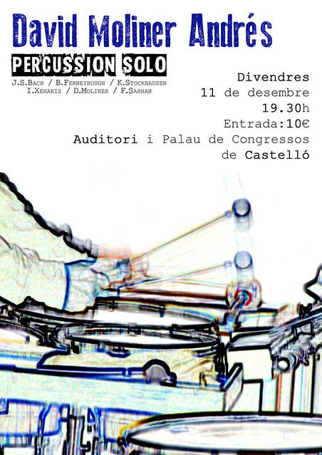 Dins del cicle “Gent d’Ací” i sota el nom de “Percussion solo”, David Moliner oferirà un concert on inclourà un variat ventall de sonoritats de música contemporània, així com clàssiques, en les quals els instruments de percussió tenen un total protagonisme. En el recital es podrà escoltar música d’autors reconeguts, com J.S. Bach, amb un arranjament per a vibràfon; música que combina el teatre musical amb sonoritats percussives (HomeworkII, F. Sarhan); obres de multipercussió (Rebonds B, I. Xenakis), peces per a instruments quotidians com: cassoles, bols,… (Bone Alphabet, B. Ferneyhough); així com improvisacions del propi David Moliner per a caixa clara. Un concert original i heterogeni, on el propi so és el principal protagonista.