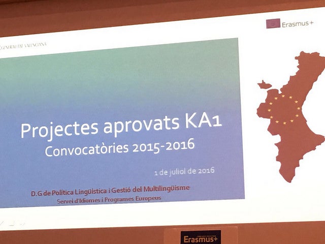 El centre està actualment implementant el seu segon projecte Erasmus+ Acció K1 titulat “Noves iniciatives per al desenvolupament personal i social dels agents educatius” amb una durada de dos anys (del 01/06/15 – al 30/06/16). Fins ara s’han realitzat accions de preparació i de difusió dels set cursos estructurats que els docents van a realitzar durant l’estiu i els propers mesos en: Noruega, Irlanda i Regne Unit. Tal és participació de quatre docents del col·legi en les jornades realitzades en el Glòria Fortes i organitzades pel Cefire de Xátiva que pretenien compartir aquesta dimensió europea amb altres docents de la província. Recordem que la sol·licitud i selecció d’aquests projectes no és tasca fàcil ja que la Unió Europea exigeix molts requisits i és qui els finança.