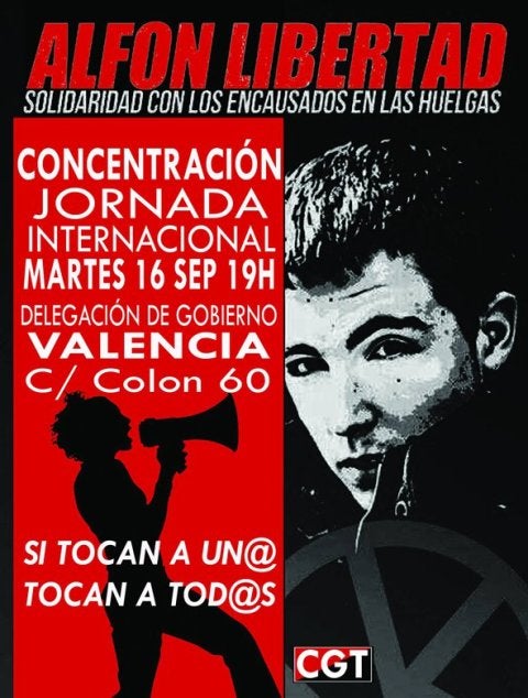 En resposta a la crida internacional realitzada per la Plataforma per la Llibertat d’Alfon, la Confederació General del Treball del País Valencià participarà en les concentracions previstes al llarg d’aquesta setmana a València, Castelló i Alacant per a exigir l’absolució del jove de Vallecas. Alfon serà enjudiciat el pròxim 18 de setembre