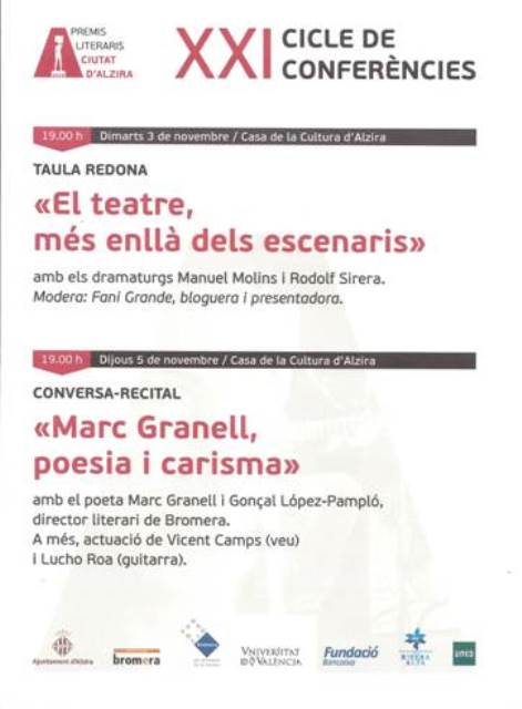 -19 h. «Marc Granell, poesia i carisma», conversa entre el poeta Marc Granell i Gonçal López-Pampló, amb l’actuació de Vicent Camps (veu) i Lucho Roa (guitarra).