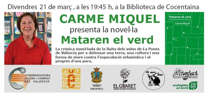 Divendres 21 de març, a les 19.45 h A la Biblioteca de Cocentaina CARME MIQUEL presenta la novel·la Mataren el verd Colla Ecologista La Carrasca – Ecologistes en Acció d’Alcoi Riba-roja de Túria