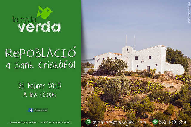 Este espai periurbà s’ha vist afectat per la plaga forestal que està matant els nostres pins (Tomicus destruens i Orthotomicus serosus), així que el repte de la Colla Verda serà reforestar Sant Cristòfol. Amb este objectiu, els voluntaris de Sagunt plantaran en esta muntanyeta garroferes (Ceratonia siliqua), llentiscles (Pistacia lentiscus) i plantes aromàtiques com el romaní (Rosmarinus officinalis).