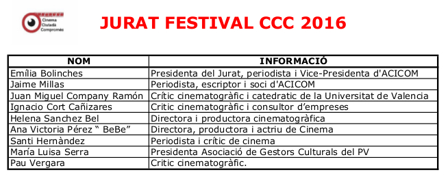 El festival compta amb un jurat, presidit per la periodista Emilia Bolinches (Vicepresidenta d’ACICOM), que resoldrà els títols mereixedors d’obtenir els guardons del FCCC 2016, el lliurament del qual tindrà lloc en Teatre El Micalet el 23 de novembre.