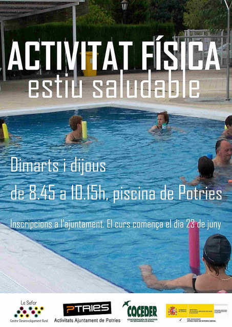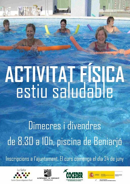 Amb l’arribada de l’estiu, el programa de manteniment física del Centre de Desenvolupament Rural la Safor, dirigit a persones adultes, es trasllada a les piscines de Beniarjó i Potries. És una activitat gratuïta que comença el dia 23 de juny. Les persones interessades es poden inscriure a l’ajuntament.