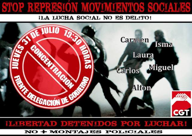 En la vesprada de l’últim dia de juliol, la CGT ha convocat una concentració que, sota els lemes “Stop repressió moviments socials, la lluita social no és delicte, llibertat detinguts per lluitar i no més muntatges policials” pretén evidenciar el clima repressiu impost pels governants.