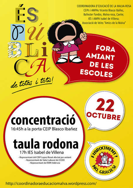 El proper 22 d’octubre a la Malva-rosa per la salut pública a les escoles i per la retirada de l’amiant al CEIP Blasco Ibañez. Convoca la Coordinadora d’Educació de la Malva-rosa.