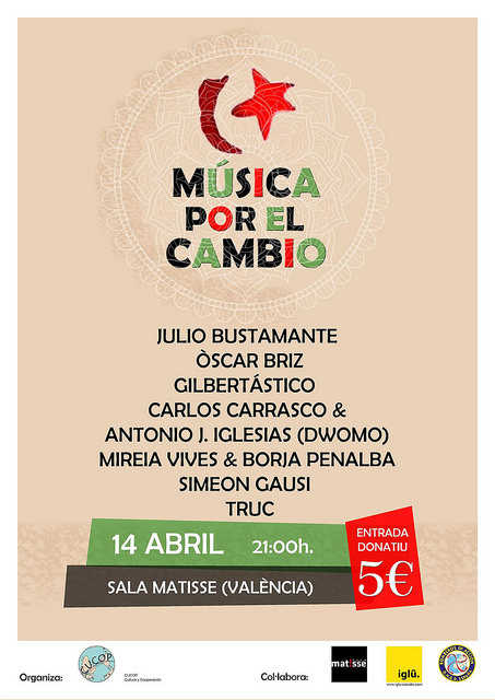 La Sala Matisse de València tornarà a ser l’escenari d’un concert solidari en el que coincidiran un bon nombre de cantant per recaptar fons a favor d’un projecte amb xiquets refugiats del Sàhara. Julio Bustamante, Òscar Briz, Gilbertástico, Carlos Carrasco, Antonio J. Iglesias, Mireia Vives, Borja Penalba, Simeón Gausi i Truc coincidiran en un concert que començarà a partir de les 21 hores el pròxim 14 d’abril. Els músics valencians han volgut unir-se en favor del projecte de cooperació internacional de l’associació Cucop, cultura i cooperació, que recapta fons actualment per poder aconseguir que un grup de catorze xiquets i dos entrenadors puguen acudir en juliol a l’Alcúdia per jugar el Cotif, un torneig internacional de futbol que compta amb categories inferiors (els sahrauís tenen entre 10 i 11 anys) i on es podrà donar a conèixer el conflicte que assetja el seu poble des de fa més de quaranta anys. El concert, titulat “Música por el cambio”, costarà 5 euros, que es destinaran íntegrament per pagar el trasllat dels joves sahrauís des del camp de refugiats de Tinduf fins territori valencià. Al Cotif participen seleccions de països de tot el món i el combinat sahrauí podrà enfrontar-se a equips de primer nivell, sent considerat un Estat-nació més malgrat les traves que assíduament els impedeixen concórrer a nivell internacional.