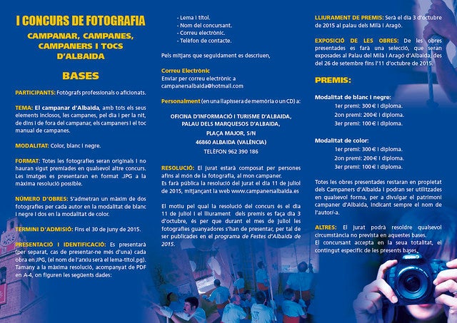 Des de la Comissió del 400 aniversari del Campanar d’Albaida animem a tots els aficionats i professionals de la fotografia a participar en este original concurs que pretén plasmar en imatges el patrimoni material com és el campanar i el patrimoni immaterial del toc manual de campanes d’Albaida, un patrimoni viu de tots els valencians.