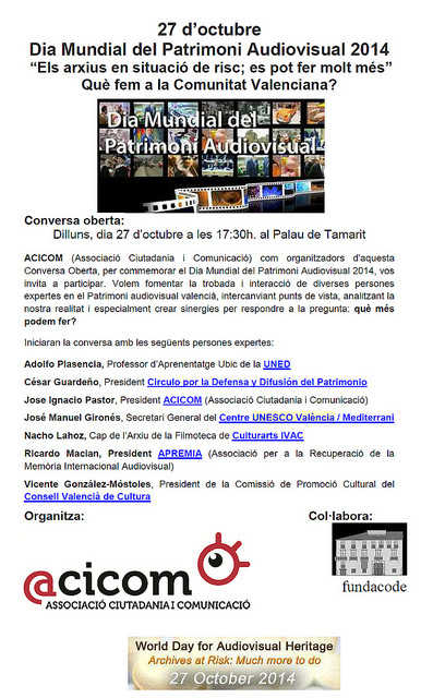 Conversa oberta: Dilluns, dia 27 d’octubre a les 17:30h. al Palau de Tamarit ACICOM (Associació Ciutadania i Comunicació) com organitzadors d’aquesta Conversa Oberta, per commemorar el Dia Mundial del Patrimoni Audiovisual 2014, vos invita a participar. Volem fomentar la trobada i interacció de diverses persones expertes en el Patrimoni audiovisual valencià, intercanviant punts de vista, analitzant la nostra realitat i especialment crear sinergies per respondre a la pregunta: què més podem fer? Iniciaran la conversa les següents persones expertes que ja ens han confirmat la seua participació: Adolfo Plasencia, Professor d’Aprenentatge Ubic de la UNED César Guardeño, President Circulo por la Defensa y Difusión del Patrimonio Jose Ignacio Pastor, President ACICOM (Associació Ciutadania i Comunicació) José Manuel Gironés, Secretari General del Centre UNESCO València / Mediterrani Nacho Lahoz, Cap de l’Arxiu de la Filmoteca de Culturarts IVAC Ricardo Macian, President d’APREMIA (Associació per a la Recuperació de la Memòria Internacional Audiovisual). Vicente González-Móstoles, President de la Comissió de Promoció Cultural del Consell Valencià de Cultura Organitza: ACICOM Col·labora: Fundacode Els documents audiovisuals, com pel·lícules, programes de ràdio i televisió, enregistraments d’àudio i vídeo, contenen els registres primaris dels segles XX i XXI Transcendint l’idioma i les fronteres culturals, apel·lant immediatament a la vista i l’oïda, a tota la ciutadania, els documents audiovisuals han transformat la societat en passar a ser un complement permanent de la constància escrita tradicional. Tot el patrimoni audiovisual mundial està en perill; no es pot dir que s’hagi preservat enlloc. No obstant això, gràcies a iniciatives com el Dia Mundial del Patrimoni Audiovisual i el Programa Memòria del Món, s’impulsa la valuosa tasca dels professionals de la preservació per gestionar els aspectes tècnics, polítics, socials i financers, entre altres, que amenacen l’salvaguarda del patrimoni. En aquest context, la Conferència General va aprovar el 2005 la commemoració d’un Dia Mundial del Patrimoni Audiovisual com a mecanisme per conscienciar a tot el públic sobre la necessitat de prendre mesures urgents i reconèixer la importància dels documents audiovisuals com a part integrant de la identitat nacional. Enguany el lema és: “Els arxius en situació de risc; es pot fer molt més” i nosaltres volem parlar de: Què fem a la Comunitat Valenciana? amb diversos experts i persones compromeses amb el patrimoni audiovisual, des dels arxius de RTVV i RTVE, als fons i materials personals, .
