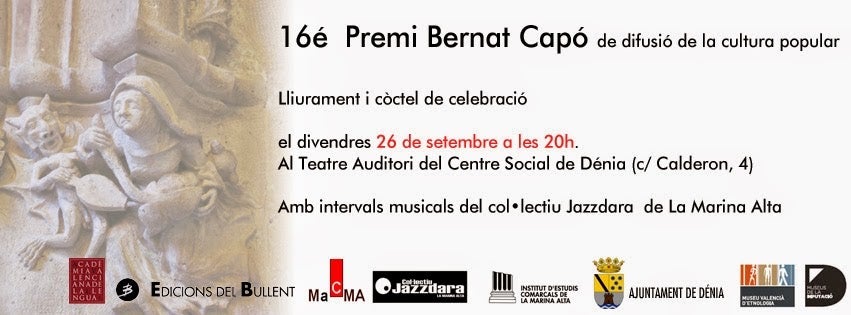 Les entitats col·laboradores i organitzadores del premi i l’acte d’entrega són Edicions del Bullent, el Museu Valencià d’Etnologia, l’Ajuntament de Dénia i la Mancomunitat Culturalde la Marina Alta, que aporta el grup de música que amenitza la vetlada, el col·lectiu Jazzdara, així com l’Institut d’Estudis Comarcals de la Marina Alta i l’Acadèmia Valenciana de laLlengua, que aporten un jurat respectivament.