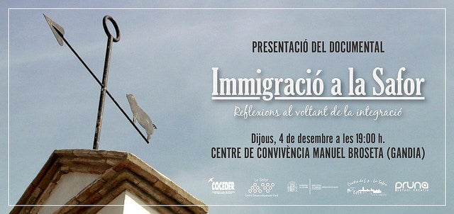 Dijous 4 de desembre, a les 19h, i al Centre de Convivència Manuel Broseta de Gandia té lloc la presentació del documental “Immigració a la Safor”, realitzat pel CDR la Safor i produït per Pruna Estudi Creatiu.