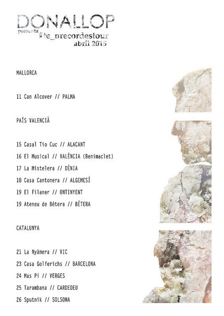 La presentació del projecte “Te’nrecordes”, i en conseqüència, la primera data la mini-gira de primavera que el grup realitzarà per Catalunya i País Valencià, tindrà lloc el proper 11d’abril al Casal Can Alcover de Palma. A continuació al llarg de dues setmanes intenses duran a terme les seves actuacions en les següents sales: