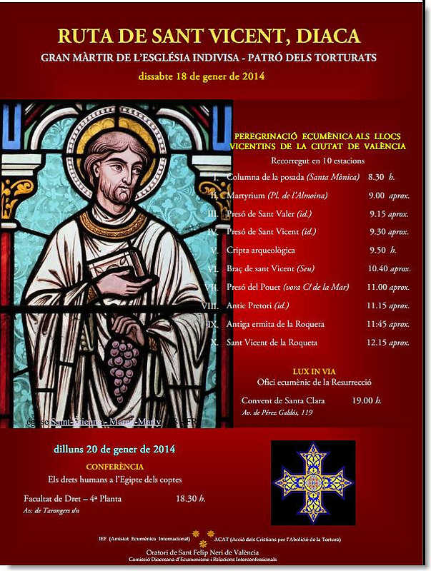 Com a exemples, podem citar la preparació de la Setmana de Pregària per la Unitat, del 18 al 25 de gener, amb participació creixent de cristians de totes les tradicions –catòlics romans, reformats, anglicans, ortodoxos, baptistes, pentecostals…–, i, dins d’esta, dos celebracions que tenen lloc a València el dissabte abans del 22 de gener i que unixen sengles aspectes recuperats de la figura del diaca Vicent: patró dels torturats i gran màrtir de l’Església indivisa. En efecte, al llarg del matí es rememora la seua passio en la Ruta de Sant Vicent, que recorre els llocs vicentins de la ciutat en deu estacions, i de vesprada se celebra l’ofici ecumènic Lux in via al Convent de Santa Clara, de germanes caputxines, que ens ajuda a caminar, “units en les diferències”, amb l’impuls de l’esperit franciscà. Lluita pels drets humans i pregària per la unitat, ecumenisme social i ecumenisme espiritual, units “sense confusió i sense separació”.