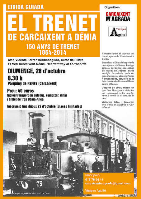 En aquesta ocasió ens n’anem a Dénia. L’excursió serà el dia 26 d’octubre i de tot el dia. Eixirem en autobús a les 8.30 del pàrquing de Renfe a Carcaixent i quan arribem a Dénia la primera faena serà esmorzar. Després ens rebra Vicente Ferrer Hermenegildo, una de les persones que més sap sobre el trenet i ens portarà a visitar les restes de les intal·lacions que queden a Dénia: l’estació (actual Museu del Joguet), cases dels ferroviaris, el port… En acabar dinarem i agafarem el tren de Dénia fins a Altea, per a gaudir d’un trajecte molt bonic, ple de pontsi tunels que ens donaran la idea de com era la línia. A Altea podrem visitar l’exposició que s’inaugura eixe dia sobre l’arribada del tren a la ciutat.