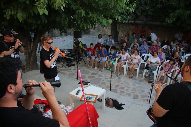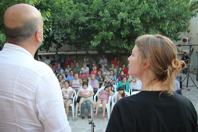 Tomàs Mestre i Ana Delia Gisbert “Taes” -què va participar en la cercavila amb la dolçaina-, van ser els encarregats de presentar la funció davant el nombrós públic congregat al pati de Les Moreres.