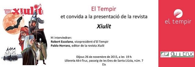 Hi intervindran Robert Escolano, vicepresident d’El Tempir, i Pablo Herranz, editor de Xiulit. Les escoles i els instituts que hi assistisquen rebran un obsequi per a la seua biblioteca: un pòster del rei Jaume I, dibuixat per Ruizge, que és una reproducció de la coberta de Xiulits núm. 6.