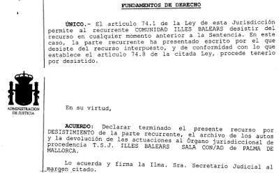 Aquest arxiu, dictat el passat dia 13 i comunicat a l’STEI ahir, es fa a petició del Govern de les Illes balears que ha desistit del recurs de cassació.