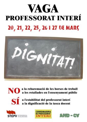 Esta vaga va ser decidida per majoria absoluta entre el professorat. Tot i això, els interins troben a faltar el suport de CCOO, FETE-UGT, CSIF i ANPE. Fins ara, la majoria dels interins han secundat esta vaga i “hem aconseguit que la Conselleria d’Educació reòbriga el tema de la negociació en la pròxima mesa esta setmana i així ens ho va assegurar el cap de personal, Jesús Carbonell” declaren des de la Coordinadora de Professorat Interí.